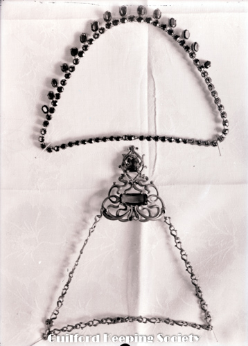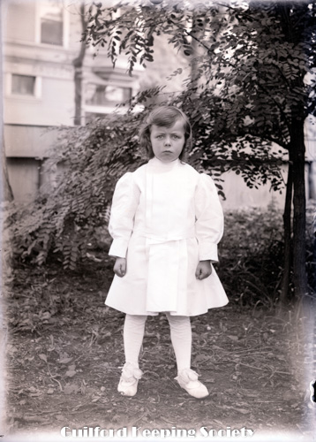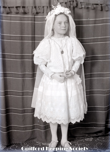 young girl in fancy dress and headpiece, possibly a flower girl or dress for first communion