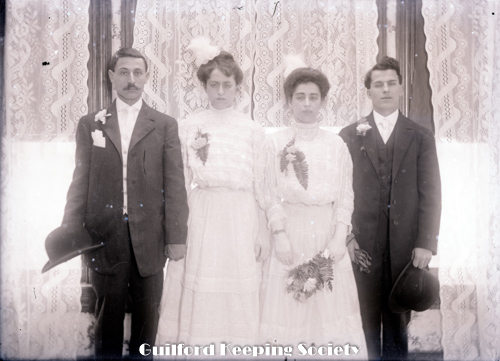 2 couples. The men are in suits. The 2 women have corsages of ferns and one holding more ferns